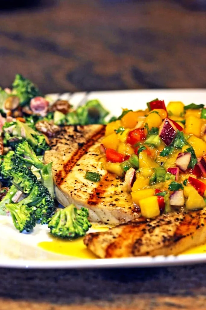 The bold flavors of swordfish and mango salsa pair beautifully with complementary sides.